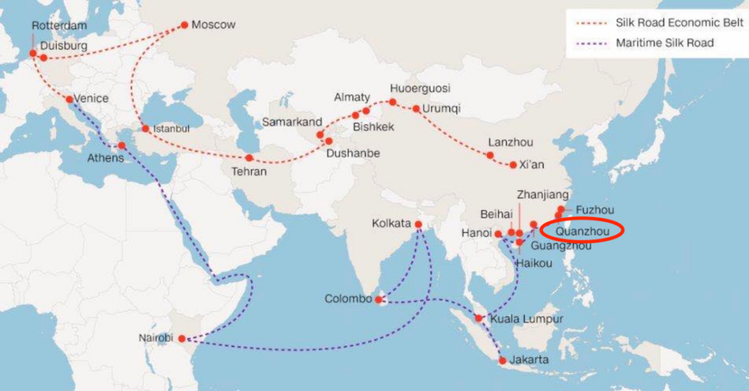 唐朝时泉州港为世界四大口岸之一,海上丝绸之路从这里起航。宋元时期为“东方第一大港”,与埃及的亚历山大港齐名,曾有“市井十洲人”“涨海声中万国商”的盛景,辉煌无比。