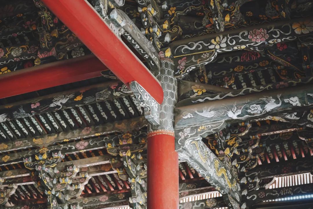 檐柱之上,斗拱层叠,梁枋纵横,饰有飞禽走兽、花卉草木等,为典型的闽南建筑特色。