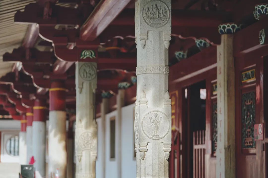 寺内的大雄宝殿用近一百根巨型石柱支撑,俗称“百柱殿”,又传闻兴建之时,有紫色的云雾笼罩在大殿上,因此又名紫云大殿。